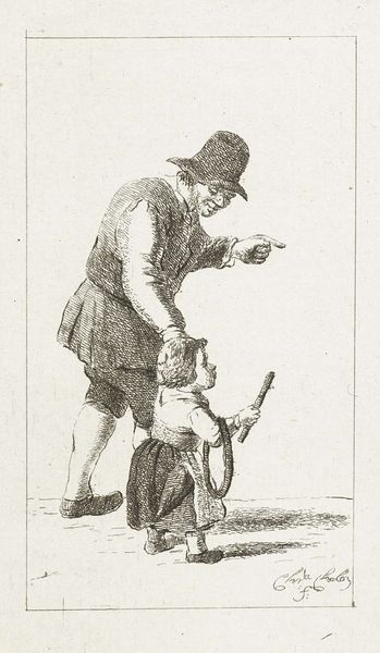 This drawing of a man with a child on a leash was made by Pieter de Mare around the late 18th century. The leash is a striking symbol. In this context, it speaks to the relationship between parent and child, hinting at guidance and control. Interestingly, the motif of a leash appears in various guises throughout art history. We see dogs on leashes in hunting scenes in medieval tapestries, but here the presence of a child introduces a curious dynamic, and the symbolism shifts. The child’s slightly raised arms might be read as a subconscious expression of the desire for freedom, yet they are physically tethered. There’s a psychological tension here: the child's striving for independence, constrained by the parent’s protective hand, and manifested through this leash. Such visual arrangements engage us on a deeper level because they echo our own internal struggles between freedom and security. The symbol of the leash, therefore, isn't merely a constraint; it's a complex interplay of love, authority, and the eternal dance of growth and control, resurfacing through time.