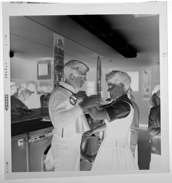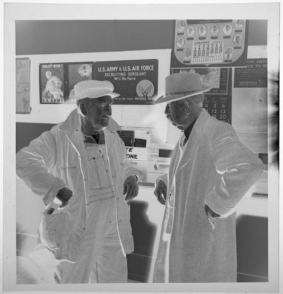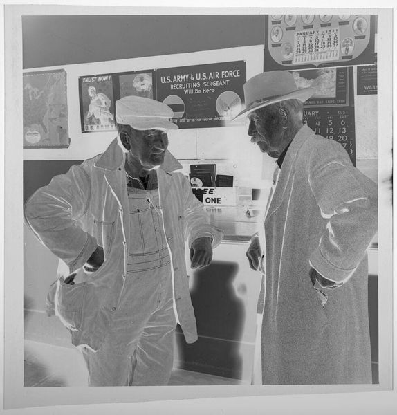 Editor: This photograph, "Untitled (men peering out of telephone booths at crowded stadium)" by Jack Gould, presents a striking scene. The men seem almost trapped, peering out. What can you tell me about it? Curator: Let's consider the materials. This gelatin silver print speaks volumes about access and class. Notice the "Peanuts" sign juxtaposed with the telephone booths. Who had access to instant communication versus cheap sustenance? Editor: So, it's about the means of communication and who controls it? Curator: Precisely. How does the photograph itself—the materials, the printing process—contribute to this narrative of social stratification and the commodification of leisure? Editor: I never thought about it that way. I see it as more of a study of human interaction, but you've made me consider the bigger picture. Thanks! Curator: Exactly! Understanding the means of production opens up new avenues for interpretation.