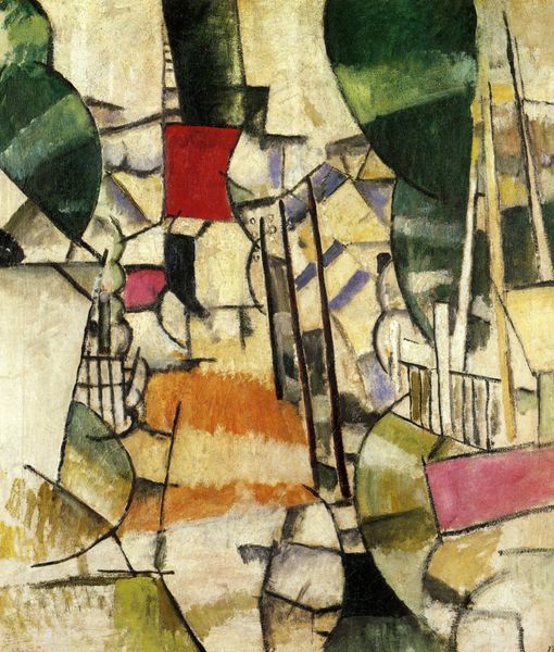 Curator: This is Franz Marc's "The Wolves", painted in 1913. Marc, of course, a key figure in German Expressionism. Editor: It's so dynamic. The shapes and colors—it's unsettling but captivating. What immediately strikes me is this raw energy conveyed through color and form; there is a jagged feel across the canvas. Curator: It's precisely that tension he seeks. Looking at his practice within the Blue Rider group, Marc often aimed to depict animals as possessing a certain spiritual purity lost to humanity. There is so much anxiety present in this Expressionist canvas. It offers insight into Marc's philosophy concerning the connection between humanity and nature amidst a backdrop of heightened political and social unrest at the time. Editor: Focusing on his materiality—the thickness of the oil paint creates this textured surface. The bold colors, the almost crude application of the paint, challenge established notions of beauty and craftsmanship. Marc is literally getting his hands dirty in the process. Curator: Right. Consider how these aren't idealized representations. The fragmentation almost foreshadows the horrors of World War I. It speaks volumes about the disillusionment many felt towards the established order. These weren’t the faithful companions that are part of so many other historical narratives involving humans and their animal counterparts; it's interesting how he inverts expectations. Editor: The color palette really draws my attention to the violent angles and fractured space of the image itself. We tend to ignore these features but doing so here is to look away from some central qualities of its creation. Curator: Yes, and understanding Marc’s context, his fascination with animal perspectives allows us to analyze themes of alienation, industrialization, the role of propaganda and power, and the place of mankind in the ever changing 20th century. Editor: I feel the physicality of the piece speaks volumes— the density of paint, the conscious crudeness. Curator: Exactly. Considering that pre-war moment enriches how we approach abstraction's emergence. It highlights a yearning for radical change across European society and visual production at this crucial moment in history. Editor: Studying it this way allows us to understand its layered approach; it brings into focus some innovative production methods. Curator: Indeed. And this fresh context expands the possibilities for current artistic discussions concerning gender, material and ecology within art-making practices across time.