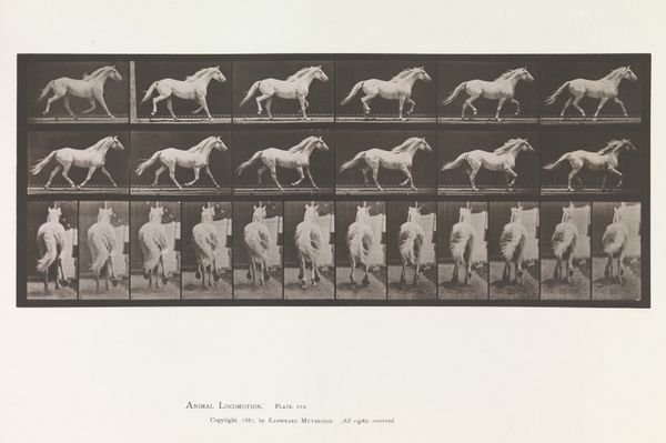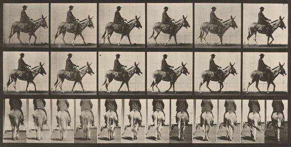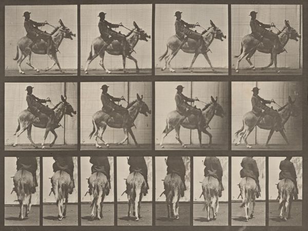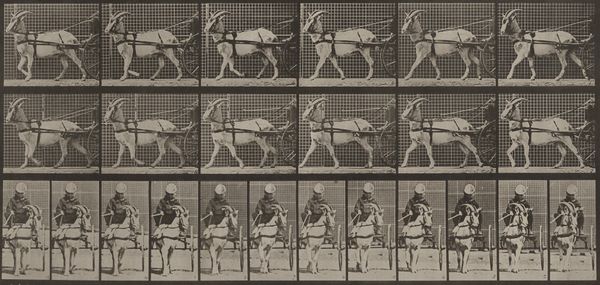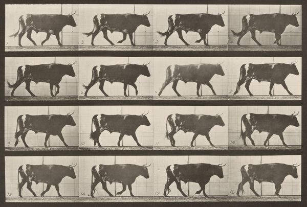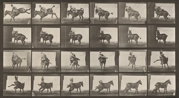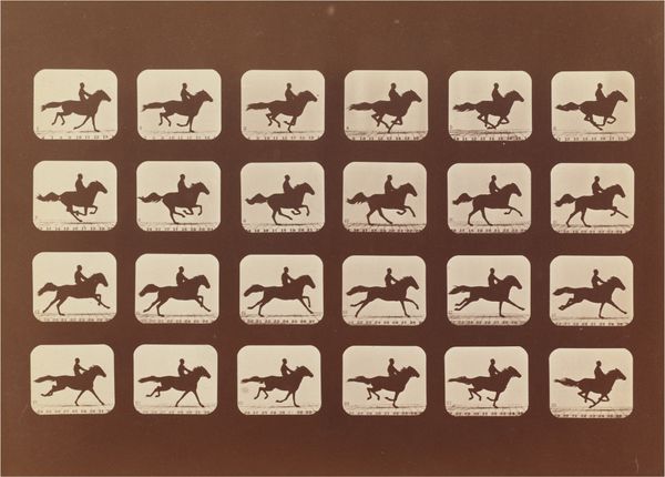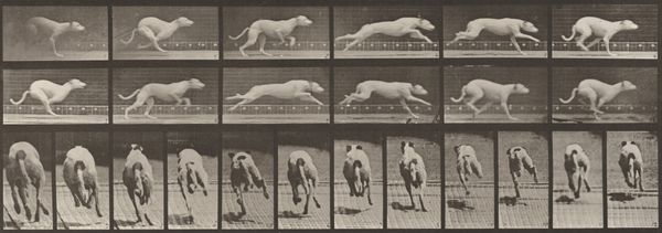 Curator: Right now we’re looking at "Plate Number 679. Goat; galloping," a gelatin silver print from 1887 by Eadweard Muybridge. Editor: My first thought? How scientific it looks. All those frames, that grid… it's like a lab experiment. Curator: Precisely! Muybridge was instrumental in bringing science into the realm of art. This series of photographs was intended to study animal locomotion, initially funded by Leland Stanford. Stanford had a theory that horses, during a gallop, lifted all four hooves off the ground simultaneously. Muybridge aimed to prove it. Editor: So, less about artistry and more about deconstructing movement into these discrete, almost manufactured steps? It feels like a commentary on labor, or perhaps the industrial dissection of nature itself. Each captured frame representing time, labor, resources put in by the artist for these prints, which were further studied, analyzed and published. Curator: The serial imagery was incredibly groundbreaking at the time. Not only did it resolve a debate in the art world of accurately representing movement, but it also became a pre-cursor to the technology of motion pictures and significantly changed visual culture and perception, challenging traditional boundaries in academic science and popular culture. Muybridge toured widely with the images, lecturing about the science of movement, making these photographic innovations available to all kinds of audiences. Editor: So its wide distribution contributed to its cultural influence? It’s fascinating how something meant to be purely observational took on so many layers. The image raises more questions than it answers: what exactly were the conditions of making these photographs? It all boils down to what gets captured, reproduced, and ultimately consumed in a rapidly changing technological environment. Curator: Absolutely. Muybridge blurred lines of high and low art, capturing something inherently beautiful—animal motion—and making it available for scientific and public scrutiny through mass-producible photographic methods. His legacy sits firmly in both art history and the history of science and technology, influencing many fields by shaping new avenues of artistic and scholarly explorations of modern life and visual perception. Editor: So in the end, it's more about motion and capturing the goat itself. More about how the photograph came to be and why? Fascinating. Curator: Exactly. A merging of science and art that reshaped both worlds.