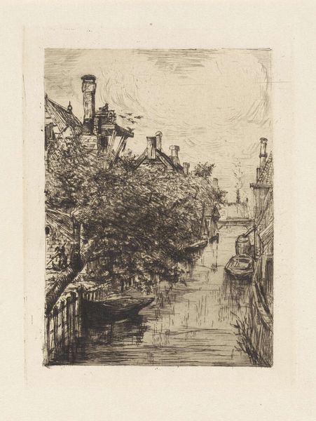 Frans Schikkinger made this print of the Nieuwezijds Voorburgwal in Amsterdam using etching, a printmaking technique dependent on acid. Schikkinger would have covered a metal plate with a waxy, acid-resistant ground, then scratched an image into that ground with a sharp needle, exposing the metal. When the plate was dipped in acid, the exposed lines would be eaten away, creating grooves. The deeper the grooves, the more ink they would hold, and the darker they would appear in the final print. Notice the variety of marks here: see the sharp, sure lines of the boat’s rigging, contrasted with the fainter hatching in the sky. This wasn't a quick process; each print would have involved careful inking and running through a press. The repetitive, skilled labor involved shows how even an image can be understood as a product of industry. Recognizing the artistry and the labor helps us to move beyond simply seeing the image, and towards understanding how it was brought into being.