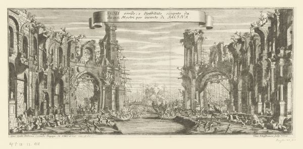 Johannes Kip created this print around 1690 to 1700, depicting London and its firefighting technology. The printmaking process itself, etching or engraving, is crucial to understanding the image. The stark black lines, the product of laborious cuts into a metal plate, emphasize the mechanical nature of the depicted fire engines. Notice the sharp contrast between the built environment and the swarming activity of the men operating the machines. The rigid, formal architecture of London seems to stand in contrast to the unruly chaos of a fire, yet both are tamed through technological innovation. This print isn't just a record; it's a celebration of human ingenuity. The very act of engraving, a painstaking process of multiplying images, mirrors the ambition to control and contain threats like fire on a mass scale. It is a testament to the social value and technological advancements of the era. Ultimately, Kip's print challenges the traditional divide between art and craft. It is a reminder that even the most utilitarian objects are products of skilled labor, and that their creation is deeply intertwined with the social and economic forces of their time.