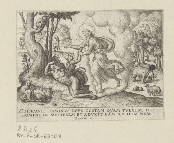 Editor: This is "God vervloekt Kaïn," or "God Curses Cain," an etching by Etienne Delaune made after 1569, here at the Rijksmuseum. I'm struck by how detailed the landscape is, contrasting with the figures, which seem more symbolic. How would you interpret the overall composition of this piece? Curator: The composition reveals a structured approach to the narrative. Delaune employs contrasting textures and forms to guide the viewer’s eye. Consider the swirling clouds, juxtaposed with the dense, linear forest. The figures, though smaller in scale, are rendered with a precision that draws attention to their placement within the landscape. It's not simply illustration, but an arrangement of formal elements contributing to the narrative's impact. Notice how the horizon line and the clusters of trees compartmentalize each of the successive phases within the narrative of Cain and Abel's exile. Editor: So you're saying the placement isn't arbitrary but carefully constructed to tell the story through visual cues? Curator: Precisely. The figures are positioned to convey not only the narrative elements but also the emotional weight. Can you identify how the artist uses line and form to differentiate God, Adam and Eve, Abel, and Cain? Observe also the inscription across the page of the print, "dixit Dominus ad Cain," referring to the literal narrative scene, where God addresses and curses Cain, and its relation to the artist's arrangement of the composition. Editor: Well, God appears separate, elevated in the clouds, while Cain seems isolated and overwhelmed, his body turned away. The sharp lines defining him certainly give off the impression of someone in distress! Curator: Indeed. Consider also the stark contrast between the meticulously rendered landscape and the relatively simpler rendering of the sheep. It forces us to ask, "Why that contrast?" Could the choice reflect a commentary on Cain's perception of the natural world versus his own actions? Editor: I never thought of it that way, but that’s fascinating. Looking at the piece as a whole and considering the artist's use of form really opens up new ways of seeing the narrative. Curator: Absolutely. It's about recognizing how the artist employs formal tools to construct meaning, inviting a richer, more nuanced engagement with the subject matter.
