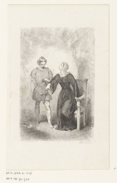 Curator: It has an ethereal quality, doesn't it? The swirling clouds and radiating light really capture a sense of the divine. Editor: Indeed. This print, attributed to Joseph Meganck, thought to have been made sometime between 1817 and 1891, is titled "Verschijning van Maria met het Christuskind aan Sint-Dominicus" which translates to "Apparition of Mary with the Christ Child to Saint Dominic." It presents a historical narrative within the visual language of academic art. We see Saint Dominic kneeling, eyes raised in reverence. Curator: I am always moved by these intimate saintly encounters with divinity. How artists envision such personal, paradigm-shifting moments… Look how carefully rendered Dominic’s robes are and the adoring little dog, a charming touch. I suppose to make divinity believable, you have to anchor it in the everyday. Editor: Meganck's work here intersects with several prevailing themes: the religious devotion during that time period, particularly given the role of the Catholic Church within broader social and political landscapes. One can read the idealized representation of the Virgin Mary as reinforcing established hierarchies and patriarchal structures. Curator: Hmmm. While that’s undoubtedly a valid perspective, and I appreciate the criticality, I also see this as an incredibly personal rendering. It could just as easily express deep personal conviction in times of intense socio-political shifts... Editor: Yes, these devotional images served multifaceted purposes. What may read now as a rigid representation, was likely functioning very differently within a 19th-century framework. Its line-work clearly owes debts to earlier engraving techniques and conveys the artist's technical training. It served as a conduit between the celestial and terrestrial realms, negotiating faith and power. Curator: And the symbolism, too. Even down to Dominic presenting the rosary. It creates a lovely focal point drawing the eye in on what is an offering to the divine. I am now curious about the artist, his position in society at that time and how it impacted this artistic decision. Editor: The act of inquiry itself is powerful, opening a space for dialogue with the work, in this case, Meganck, beyond temporal boundaries. The visual encoding of the piece encourages a continual questioning. Curator: Nicely put, I think I am starting to question everything now.