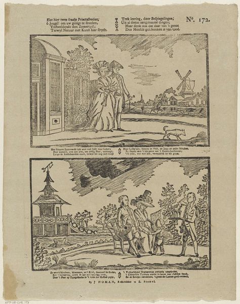 Curator: This etching by Mindermann & Co., created sometime between 1814 and 1848, titled "Hier ziet gij 't lang beleg; dat Deventer eens duldde," really throws you back in time, doesn’t it? It's almost like peering through a crack in history. Editor: It definitely has that feel! It's a series of small scenes, almost like a comic strip, depicting a battle or siege. The landscape is very stylized. What exactly is going on here? Curator: What jumps out at you in terms of the overall feeling, irrespective of what’s happening? Does it feel like triumph, loss, a bit of both maybe woven in this moment? Editor: It feels... chaotic. Like a messy, confusing struggle. Maybe more of a somber feel since the ending isn't obvious, just struggle. The figures seem very small against the landscape, making them seem insignificant in the face of this historical event. Curator: Yes, good! It makes me consider: Is the artist trying to comment on the futility of war, despite the supposed heroism of it all? And what about the text above each image? Does that strike you as informative captions, or perhaps something more… emotional? Editor: Well, if it's anything like historical ballads or tales from the time, there's probably a mix of propaganda, factual depiction, and good old fashioned patriotism all swirled in together. Curator: Exactly! So even what seems to be a clear depiction of history can also be read through layers of sentiment, wouldn't you say? Editor: I think so. It shows me that even what looks like a simple image is loaded with all sorts of potential interpretations. I had been stuck on the chaotic nature of the image itself and forgot to look into context, time and background! Curator: Well, looking is only the beginning, the exciting part comes next: seeing.