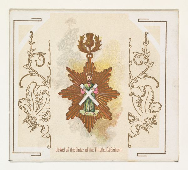 Curator: What a striking piece of graphic art! This is a chromolithograph, a print from the “World’s Decorations” series, created in 1890 by Allen & Ginter for their cigarette packages. It depicts the Austrian Order of the Golden Fleece. Editor: It's fascinating how luxurious it feels, considering its origin as a cigarette card. The vivid pinks and blues of the medal against the cream background give it an unexpectedly regal air. Curator: These cards were intended to be collected and traded, which highlights the role that tobacco companies played in disseminating imagery of power and prestige to the masses. This particular medal represented inclusion in a highly exclusive, aristocratic circle. Editor: The design is clearly drawing from the Art Nouveau style with its decorative, flowing lines and the naturalistic laurel wreath framing the image. What I find interesting is the material contradiction: a symbol of old-world aristocracy used as a disposable consumer product. Curator: Absolutely. And let’s consider the production: mass-produced color lithography, involving a whole chain of labor, put this image into the hands of everyday consumers. It democratizes the consumption of aristocratic imagery while simultaneously reinforcing those power structures. Editor: So it's really about making the inaccessible accessible, packaging status, literally, for mass consumption. The symbolic value becomes another commodity. Curator: Exactly! The appeal of these cigarette cards lay in the material value they provided to the collector—the detailed artistry and colorful printing on these small cards spoke to a certain value of skilled production. The use of printmaking made luxurious things accessible in some sense. Editor: Seeing it through this lens of mass production makes me think differently about how visual symbols circulate within a culture, impacting viewers. Curator: Me too! It is incredible how an object as ephemeral as a cigarette card can offer insights into broader themes of social status and visual consumption in the late 19th century.