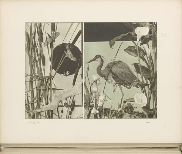 Curator: Just look at this intimate photograph—a gelatin silver print titled "Lepelaar bij nest met drie jongen," placing spoonbills by a nest cradling three young ones. This work, dated roughly between 1870 and 1940, certainly captures a quiet scene, wouldn't you agree? Editor: Intimate is the perfect word. There is a stillness here, almost like witnessing a secret. A moment suspended. The gray palette only enhances that sense of hushed reverence, drawing the eye to the shapes instead of colors. Curator: It's certainly a change from a lot of works on display here. Made during the Pictorialism movement, it’s so interested in mood and composition over sheer realism, in achieving an artful photograph, almost painterly in its focus. It looks a landscape but still somehow has the feeling of a still life. Editor: And that’s so fascinating! Spoonbills, the white bird against the dark reeds and grasses – immediately the piece puts me in mind of ancient, almost Egyptian imagery, those iconic, simplified profiles in hieroglyphs and tomb paintings. They both signify a connection to nature, a simplified way of portraying movement and life... the iconic presence is compelling. Curator: You make an interesting point, but there's also this beautiful chaos! The blades of grass forming a curtain, not fully obscuring but softening the edges and light… the focus being the young fledglings, maybe only a few days old, their long spindly legs bent around themselves as the Mother shields them. There’s nothing quite as striking as Mother and child to trigger our emotions. Editor: It is truly primal, the universal appeal of protection, nurturing. The placement within those reeds becomes almost womb-like; nature enclosing the family. As humans, do we instinctively read into this scene? The safety and vulnerability present in these animals trigger empathy? Curator: It certainly is beautiful and quiet in its impact. It speaks to something deeply embedded in us. It will stick with me today. Editor: Absolutely. Something quiet and powerful in a delicate, gray shell.