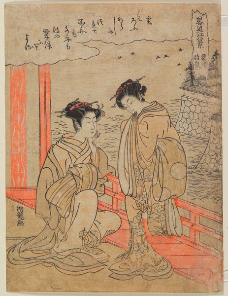 Curator: Here we have Isoda Koryūsai's "Sotoba; One of Seven Komachi," a woodblock print dating from 1770 to 1790. Editor: What strikes me first is the almost dreamlike quality of the smoke, how it writhes and dances between the figures. It feels like the air itself is alive with unspoken sentiments. Curator: Indeed. Let's consider the materials and process. This is a Ukiyo-e print, meaning it was produced using multiple woodblocks, each carved with meticulous detail and then inked to create the final image. This was very labor intensive, yet affordable art accessible to the merchant class. Editor: And the figures! Note how Komachi, a famed poet of Heian era Japan, is a popular theme with 7 known interpretations of her life! I find their postures and subtle expressions particularly interesting. Both figures have pipes, emphasizing this image deals with socializing through ritualized use of personal tools. Their long sleeves imply leisure, hinting towards this cultural theme with all its potential social implications! Curator: Precisely. Koryūsai was a master of capturing the fleeting fashions and lifestyles of Edo period Japan. The kimonos, the hair ornaments—these are not simply aesthetic details; they are indicators of social status and cultural identity. Notice the quality of the print, which shows how even in something "everyday" the makers were conscious about communicating social status. Editor: I also wonder about the context of the scene itself. The tree laden with blossoms evokes a sense of transient beauty, a common motif in Japanese art that mirrors the ephemerality of life itself. But note how this transient natural imagery contrasts with the rigid structures upon which she sits - implying tension and possibly an exploration of natural life conflicting with material reality. Curator: Perhaps the artist wishes to draw attention to the material needs met for transient appreciation and ritualistic enjoyment of pleasure. That even the ephemeral necessitates labor and consumption. Editor: I see that interpretation! It is truly remarkable how a single image can contain such a wealth of symbolism. Koryūsai captures a transient, cultural snapshot of social practice with his understanding of tradition! Curator: A point well made; the genius in examining Ukiyo-e art involves seeing the deep intersection between materials, social conditions, ritual, and culture, bringing insight into their interconnected roles of material making and meaningful visual display.