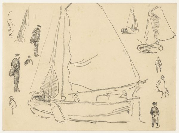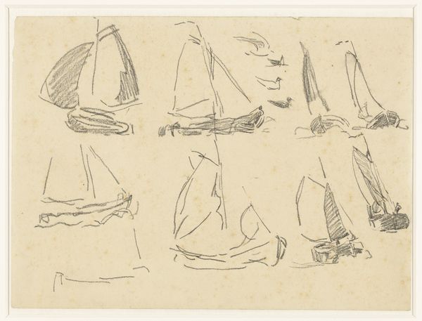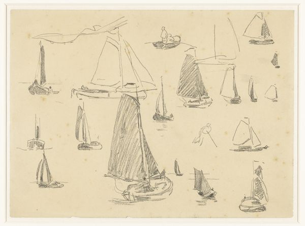 Curator: This is Willem Bastiaan Tholen’s "Studieblad met diverse boten," a sketchbook page with various boats, created sometime between 1870 and 1931. Editor: Ah, it’s all sketches. Fleeting, like catching thoughts before they sail away. The light pencil work gives it this airy, almost dreamlike quality. Curator: Precisely. The rapidograph pen and graphite pencil on paper tells a story of quick observations, a direct engagement with the subject. What's interesting to note is how the artist seems to experiment with the form, some sails only as outlines, while others have more detail. Editor: Yes, and you get the sense of movement, don’t you? The boats bobbing, the water…even the little puff of smoke from that tiny steamer feels alive. Curator: The Rijksmuseum holds this sheet, a physical object handled and worked upon by Tholen. We’re essentially seeing his thought process, the evolution of his understanding. How the repetitive rendering can also show something of the routine within art. Editor: I wonder where he was, sketching these. Was it a bustling harbour or quiet backwater? It makes me think of my own sketchbooks...full of half-formed ideas and impulsive drawings. Curator: It really transcends simple representation. These boats aren't just boats; they are artifacts imbued with Tholen’s labour, with their own context in history, industry, trade, and even leisure. The paper, the materials, are tied to vast global networks. Editor: Absolutely, this sheet feels deeply personal but resonates beyond its humble means. There's a kind of honesty to its simplicity. Curator: Agreed, these rapid impressions really allow you to connect to Tholen's vision. Editor: What a pleasure, the quiet murmur of ink across paper and all these journeys ahead.