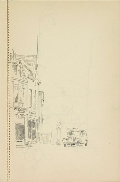 Curator: Cornelis Vreedenburgh created this pencil drawing, "Figuren en een bakfiets op een straat," sometime between 1890 and 1946. Editor: It's so delicate! I get a ghostly feeling, like peeking into someone’s memory of a city street. Was he just passing by, sketching as he went? Curator: It is an excellent question, because his sketchwork really puts emphasis on the street, where labor and movement intersect within the urban experience, something often overlooked. The figures are indistinct, serving as stand-ins for a larger societal body and a class of workers often disregarded in mainstream representations of the Netherlands during this era. Editor: Exactly! The bakfiets, that cargo bike, it's right in the center. I feel the artist really captured the mundane, everyday reality of labor. There's something deeply honest about this depiction. No romanticism, just pure observation. Curator: Precisely. Looking through a critical lens, one could say that the understated nature of Vreedenburgh’s street scene becomes a subtle yet forceful commentary on the role and status of laborers in society. What might appear like a simple sketch, thus speaks volumes when interrogated further! Editor: You're right! At first, it felt simple to me, even accidental, like something scribbled on the go, but your context makes me reconsider. There's depth in this quick sketch, a social conscience I almost missed. That cart really is center stage. It is fascinating how such a fleeting impression can become an enduring cultural record. Curator: And from an intersectional point of view, we also get the opportunity to highlight not just the worker, but the whole street context. By deconstructing this kind of visual narrative, we shed some light on the issues impacting society. Editor: Well, that’s deepened my appreciation considerably! Initially I thought, 'charming sketch', but now it feels like a silent protest, wrapped in muted pencil strokes!