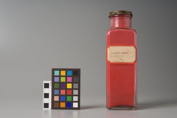 Curator: Here we have "Alizarin Crimson," a pigment manufactured by Tizian Color Co., displayed within a glass jar. The intensity of that red is striking! Editor: It's fascinating how a single color can evoke so many associations. Alizarin Crimson, beyond its chemical composition, resonates with the history of labor and extraction. Curator: Yes, the texture seems almost palpable through the glass. And consider the minimalist presentation: the jar, the label, and that color chart nearby... it creates a dialogue between the object and its context. Editor: Precisely! It brings to mind the problematic history of synthetic dyes—the displacement of natural dyes and exploitation of labor that went into their production. Curator: Perhaps, but let's not overlook the sheer vibrancy of the color itself. The saturation pulls your eye, demands your attention. Editor: And what does that demand signify when we contextualize it within histories of industrial capitalism? Curator: A thought-provoking contrast indeed! Editor: Absolutely. This jar invites us to consider the complex narratives woven into something as seemingly simple as a color.