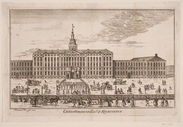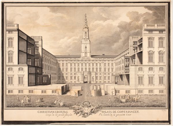 Louis Auguste Le Clerc created this detailed rendering of Christiansborg Palace in Copenhagen using pen and brown ink, capturing a moment of bustling activity in the royal court. The composition is meticulously structured, creating a sense of depth and grandeur. Le Clerc employs linear perspective to draw the eye towards the palace, emphasizing its symmetrical layout. The use of light and shadow is subtle, almost understated, highlighting the architectural details. Notice how the linear patterns of the palace’s windows and the cobbled ground contrast with the organic shapes of the clouds. This contrast reinforces the structured, rational design favored in the architecture of the period, reflecting an age of reason and order. The palace is not merely a building; it functions as a sign, a cultural signifier of power and authority. The artist's formal approach transforms the palace into a semiotic system. We are invited to decode the visual elements and acknowledge the cultural codes. It is a statement about the state, its values, and its aspirations.
