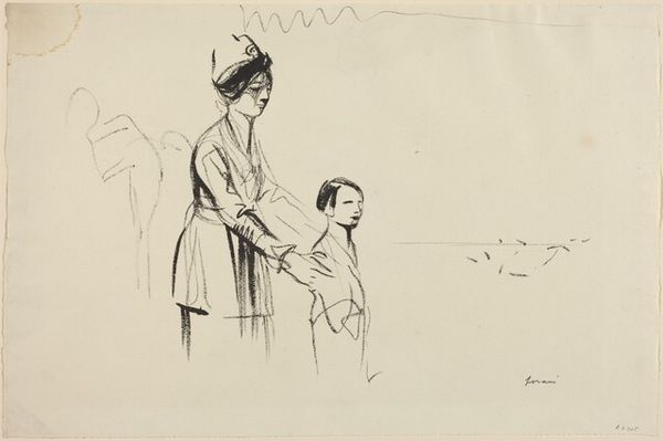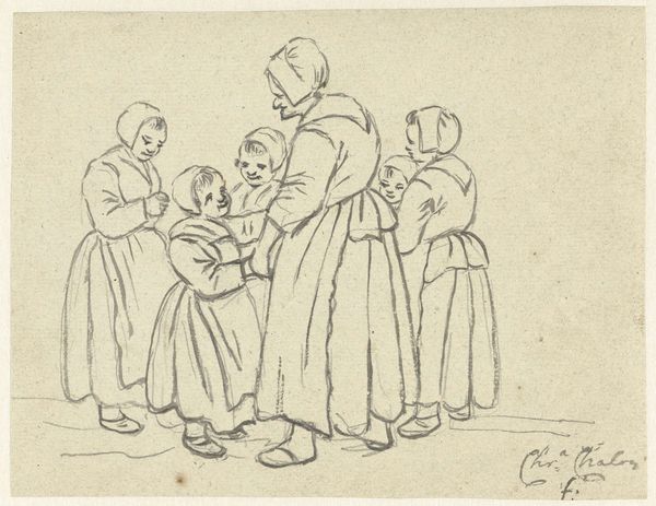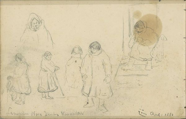 Editor: So, this drawing, “Kids” by Bernard Naudin, is estimated to be from around the 20th century and is currently held at the Minneapolis Institute of Art. The pencil rendering gives the scene such a sense of urgency, of people on the move. What stands out to you in this piece? Curator: What grabs me is the inscription: "My kids, this is ‘Pay Saturday.’” It reframes everything. Now, consider the era; early 20th century. Think about economic disparities. We are looking at a glimpse into working-class life, possibly a family heading to collect wages, or perhaps they’re facing eviction, reliant on that income to maintain stability. Editor: That's fascinating. I hadn't focused on that inscription. It adds such a weight to the image. It humanizes what could have just been a simple study of figures. The expressions of the children, especially, now feel so poignant. Curator: Exactly! Consider the museum’s role. By exhibiting this, they’re participating in a conversation. What kind of social commentary is happening by framing working-class struggle within a space of fine art? Is it elevation, exploitation, or something in between? Editor: So, by exhibiting a drawing like this, the institution is shaping how we understand both the artwork and, potentially, the realities of the subjects depicted? Curator: Precisely. Think about the power dynamics inherent in that process. Editor: That’s a powerful perspective to consider, reframing my perception completely. Thanks for illuminating that! Curator: Likewise. Thinking about how institutions shape meaning keeps the experience fresh.