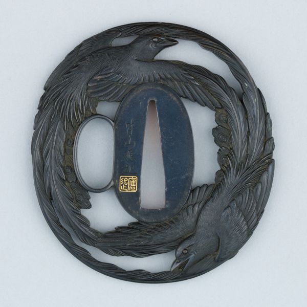Curator: What catches your eye immediately about this piece? I find the stark metalwork creates an undeniable feeling of tension. Editor: Definitely a raw, almost aggressive elegance, wouldn't you agree? But let's start by telling everyone what we're looking at. This is a sword guard, or tsuba, from 18th-century Japan, made by an artisan from the Akasaka school. You can find it here at the Metropolitan Museum of Art. Curator: Thank you, exactly! What strikes me is how functional a sword guard is at its core: designed for protection, for war even. Then an artisan transforms it with these beautiful—though seemingly simple—lines into something considered "art". Who makes such an object, how does its function affect that making? Those details are key. Editor: Agreed, context is important. However, the visual rhythm the artist created, how the negative spaces play against the wrought iron... It’s stunning how something meant to defend can be so open, permeable. Consider its composition: The center is clearly defined, but the "branches" extend and reach. It is more than protection. Curator: See, for me, the medium – that unforgiving metal - speaks volumes about the blacksmith's skill. The metal itself demands a laborious process that’s deeply rooted in material practice. We also can’t overlook how sword culture impacted art of the time. This wasn’t simply decoration, right? Swords embodied status, duty. Editor: Certainly not simply decoration. Its beauty derives from a reduction of form, a controlled restraint within that metal. It directs the eye, doesn't it? It speaks to both the rigor and the artistry valued in feudal Japan. Even its circular shape conveys meaning. Curator: The circulation and the re-circulation through art. The circulation through trade. That’s interesting, the way meaning changes depending on access. Now, held safely behind glass, what do we see? Is there meaning beyond status to find? Editor: It shows, I believe, that strength lies in a refined simplicity and an unwavering execution. A tsuba serves its deadly purpose while presenting such sophisticated beauty. I feel moved every time I examine its meticulous details. Curator: Meticulous details—for me it serves as a reminder that every artifact holds stories of labor and cultural value we must unveil through constant analysis of each mark!