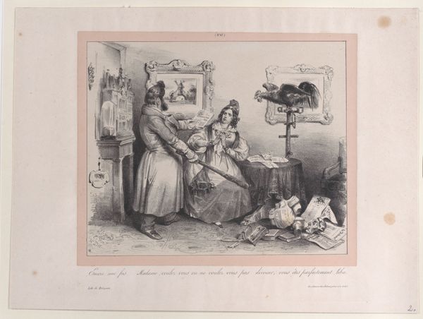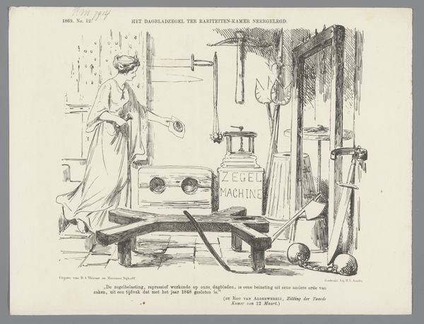 Johan Michaël Schmidt Crans created this print, titled "Spotprent," in 1878. The artwork is a political cartoon, a popular medium for social commentary during the 19th century. The image shows a woman, possibly symbolizing a political entity, tending to a fire in which papers marked with "Wederkaer" are burning. On the hearth is a paper titled "Overschot," translated as "surplus." This visual suggests themes of sacrifice, but also of getting rid of things that are no longer useful. Crans's artwork reflects the political climate of the time, addressing the financial management and perhaps the discarding of old policies by the government. The emotional weight of the piece lies in the act of letting go of past decisions for the promise of a new beginning. The artist invites us to reflect on the cyclical nature of politics and the human element inherent in governance.