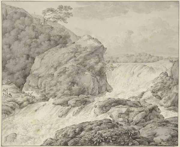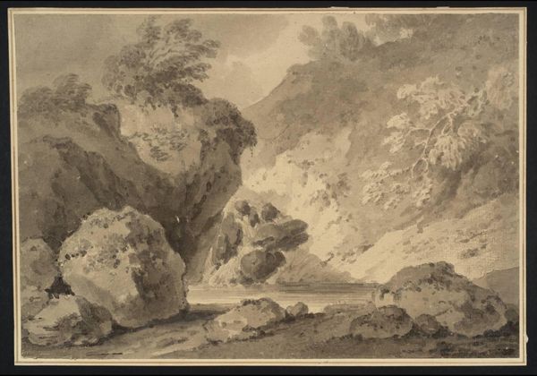 Franz Kobell created this 'Rocky Mountain Landscape' using pen and black ink with gray wash. Dominating the composition are the towering rock formations, rendered with meticulous detail. The artist uses the wash to model forms, creating a sense of depth and volume. The dark lines and textured surfaces create a compelling interplay between light and shadow, evoking a sense of awe and the sublime. Consider how the arrangement of elements guides your eye through the landscape. The juxtaposition of the rugged rocks and the softer foliage creates a balanced yet dynamic composition. Kobell uses the landscape to explore themes of nature, beauty, and the power of the natural world. The careful rendering of textures invites a sensory engagement with the scene, allowing viewers to almost feel the rough surfaces of the rocks and the delicate leaves of the trees. This piece stands as a reminder of the enduring appeal of landscape as a vehicle for artistic expression. Each stroke and wash contributes not only to the aesthetic appeal but also to a deeper exploration of our relationship with nature.