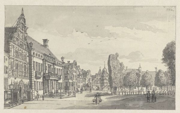 Curator: The “Double House for Mr. Straus, Perspective View,” conceived in 1883 by Adler and Sullivan, Architects, presents a compelling architectural drawing executed in ink and pencil on paper. What strikes you upon first seeing it? Editor: It's austere, yet inviting. The intricate detailing against the cloudy, almost turbulent sky creates an intriguing visual tension. Curator: Indeed. I am immediately drawn to the methods and means of representing this architectural concept. Note how the very materiality of pencil and ink work to delineate class structures. Mr. Straus would have commissioned a rendering such as this to solidify his status within the upper echelons of Chicago society. The means of production – drawing, paper, and ink – are as essential as the intended architectural space. Editor: Precisely. The neoclassicism that defined architectural principles during that time dictate that the composition adhere to visual elements, such as the symmetry achieved by duplicating design, to create a calming stability in its façade. Also, the delicate balance of the natural with architectural rigidity, trees and humans as details within the architecture itself, creates a very pleasing harmony. Curator: The figures become ciphers. Notice their lack of individual expression; the building becomes the main event. Think too about how this piece, at its moment of creation, was meant as a sales proposal of sorts, where the idea of owning this “Double House” also suggests an implicit endorsement of an upper-middle-class aspiration and promise of security. The value it carries transcends purely aesthetic judgment. Editor: I see it too, as the building blocks within this 19th-century aesthetic value structure; materials, shape and spatial positioning convey meaning. Yet, the building itself serves as more than status or economic structure when observing details of each window and stone to discover a wealth of minute elements working in tandem to express balance through shape, scale and composition. Curator: A fascinating balance of form and function, class, consumption and artistic statement, I’d say. Editor: I agree. A complex tapestry woven into a single image through an exquisite balancing act!