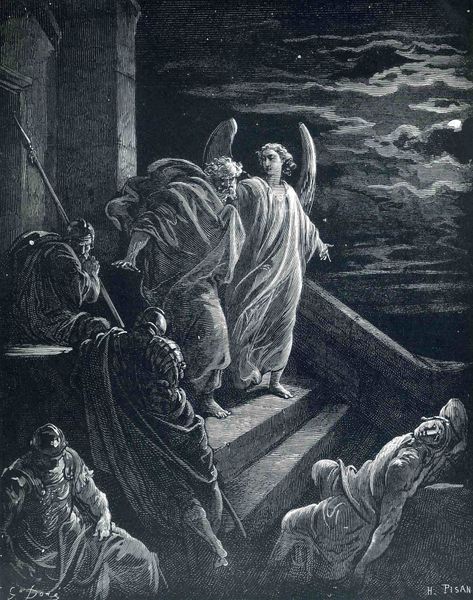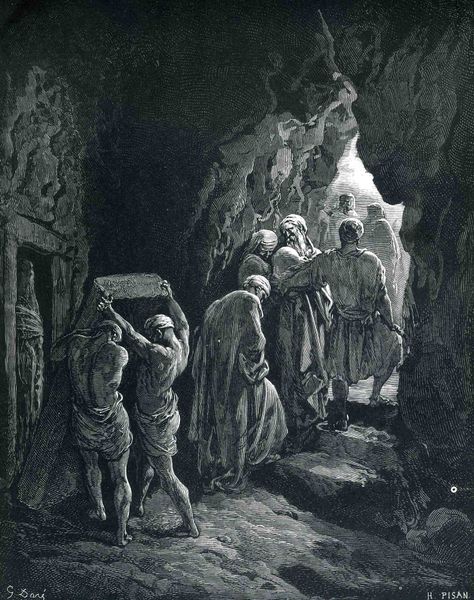 Curator: Here we see Gustave Doré's engraving, "Resurrection of Lazarus." The artist powerfully depicts the biblical story of Jesus raising Lazarus from the dead. What strikes you first about it? Editor: The dramatic contrast between light and shadow, it's almost operatic. The darkness of the tomb and then, piercing it, this burst of divine light… and Lazarus blinking, struggling to return. Curator: The use of light is certainly key. Doré employs engraving techniques to create this sharp contrast and add emotional depth to the religious narrative. For centuries, Lazarus has served as a potent symbol, hasn’t he, of the power of faith and the possibility of overcoming death. The image here gives shape to our hopes for that overcoming. Editor: Absolutely. But what interests me is Doré's broader project. He aimed to make these bible stories relatable, understandable, visible for the modern 19th-century audience. Lazarus emerging almost reluctantly seems more human than divine, a perspective many embraced. It shifts the miraculous towards a psychological portrayal of recovery. Curator: And that psychological element speaks to the heart of the symbolic value – of spiritual awakening, new beginnings after despair. In iconography, light is always associated with truth and divine presence; but in Doré’s hand, the dramatic play emphasizes internal struggle, even the fear of the unknown of afterlife. Editor: Indeed, notice those shrinking figures surrounding Lazarus and Jesus; not ecstatic faith, but almost terrified doubt at seeing the established social orders disrupted! It's interesting that Doré uses a Romantic style, usually employed for scenes of sublime natural grandeur, here applied to a miracle. He transforms the bible from a historical narrative to an emotionally charged visual experience that engages viewers of any background to respond to universal concerns of human existence, life, and death. Curator: Exactly! He encourages empathy, doesn’t he? Perhaps Doré wanted to reveal to people their relationship with the old narrative in a way that they find hope for the future of society. Editor: Well, either way, it serves as a lasting reminder of art’s power to shape our understanding of even the most foundational stories. Curator: A powerful piece. And a fitting example of how historical narratives intersect with the visual vocabulary of their era.