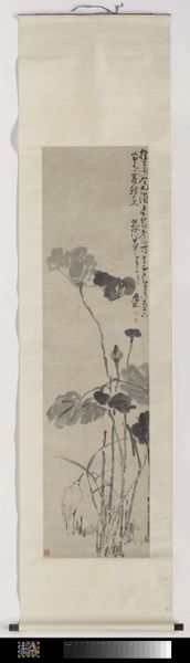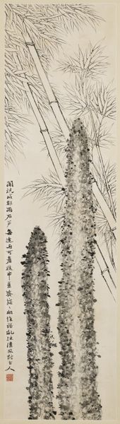 Curator: I see so much vitality in the monochromatic harmony here, like a little theatre being set up. Editor: Indeed! This artwork is titled "Cock and Banana Leaves," and is an ink drawing by Ding Yanyong. Curator: Ah, that banana leaf does so much to contextualize this feisty looking bird. It feels incredibly immediate, almost as though the rooster just happened to wander in front of the painter while he was working on a study of foliage. Do you get that sense of casual observation? Editor: I do. To me, the cock carries such deep resonance—historically it represents courage, vigilance, even the rising sun! A potent symbol across cultures. The banana leaves offer not only setting, but perhaps speak of abundance and life. What’s so remarkable is how Ding captures these layers with what seems like effortless strokes. Curator: You're spot on with "effortless." Look how few lines he uses, and the way the ink bleeds subtly… yet that tiny, imperious cock struts right off the page! He's got a definite 'look-at-me' energy, a contrast to the generous fronds, creating a delightful visual push and pull. Editor: Precisely! It brings into focus a dialogue between boldness and provision, the proud individualism framed within the generosity of nature. Furthermore, in much Eastern art, empty space is equally important, leaving plenty to the viewer’s imagination to complete the narrative. Curator: True. The emptiness is a charged stillness, ripe with possibilities. Perhaps the artist wants us to ponder our place in this composition…are we the farmer admiring his prize rooster, or another bird eyeing him warily? I suppose the artwork gifts to us endless interpretations, based upon our relationship to the rooster! Editor: Well said! Considering the rich cultural symbolism at play and the stark beauty of its composition, it serves as both a visual meditation and cultural mirror! I won't forget it. Curator: Nor I! Such simplicity…it always conceals universes. A true marvel of concise artistic statement.
