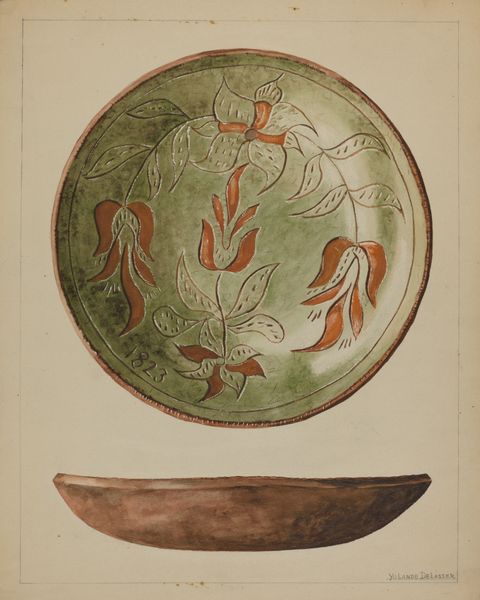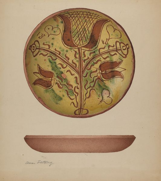 Curator: Here we have a Pennsylvania German Plate dating back to around 1940. It's crafted from earthenware and employs a mixed media approach. What are your first impressions? Editor: There's an endearing simplicity to it. It feels grounded, humble even. The colors are muted, and the design, while whimsical, feels deeply connected to the earth. It almost evokes a sense of naive art, full of sincere intent. Curator: It speaks to the folk art tradition very strongly. The peacock motif, common in Pennsylvania German art, is particularly resonant. Throughout history, the peacock is one of the most meaningful and powerful symbols. I wonder if, here, it symbolizes renewal, and perhaps even immortality for this plate’s owner. Editor: That’s intriguing, especially given the regionalism stylistic undercurrent. The peacock, though often associated with wealth and display, seems democratized here, brought into the home and everyday life of ordinary Pennsylvanians. This makes a bold statement about the accessibility and integration of high cultural symbols into common society. Curator: Absolutely. The tulip, also visible, frequently appears in Pennsylvania German art. Its bulbous shape can easily stand as a symbol of both fertility and home. Editor: I can see the synthesis of German traditions, repurposed and translated to a new world, in its visual language. A coded language spoken within a community. How powerful to communicate identity through images. I mean, let’s not forget this plate, besides its more decorative function, was utilitarian and thus at the core of someone’s everyday domestic life. Curator: Right, these weren’t merely decorations. They carried the weight of cultural identity and served as quiet affirmations of community. It serves as a reminder that beauty, art, is interwoven into even the most commonplace objects. The decorative carries deep significance and value. Editor: Thinking about it makes me see how objects around us today can function in the same manner—perhaps as powerful symbols of a sense of belonging. It would be fascinating to consider their symbolism, and how those will evolve and shape the future memory of our cultural present.