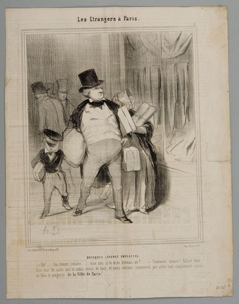 Curator: This is "Man Shouting at a Deaf Man" by Paul Gavarni, created around 1842. It’s a lithograph, so a print, showcasing a slice of 19th-century life with a humorous twist. Editor: It strikes me as a bit satirical. Two men, one shouting into the ear of the other, who clearly isn't hearing a thing. Given that Gavarni’s known for social commentary, what was he trying to say about society at that time? Curator: Exactly. The brilliance of Gavarni lies in his ability to capture the social absurdities of his time. In 1842, France was experiencing rapid social changes, a widening gap between different social classes, and political tensions. This print comments on communication or the lack thereof. Consider the title "Revers des Medailles"—the other side of the coin. Editor: So, it’s more than just a funny image? Is it implying that communication is failing in other aspects of French society? Curator: Precisely. Perhaps communication between social classes, or even within the government? Notice the setting. It’s a public space, and their interaction becomes a spectacle, highlighting the performative nature of social interactions. And note the man's dress and the setting. Are they communicating something about class dynamics? Editor: That’s a good point. They seem to be part of the bourgeoisie, in top hats and fine clothing. So, maybe he is satirizing their own inability to connect despite being in the same social circle? The absurdity, as you say, comes through so sharply. I'm curious, what did viewers at the time make of this? Curator: Good question. I suspect it was considered humorous social critique; people found something relatable in the challenges of communication and the posturing inherent in social life. Perhaps it still resonates today because miscommunication feels evergreen. Editor: I agree! I see a lot more in this print now than I did at first glance. Curator: Absolutely! The context in which the artwork was created and circulated really does make all the difference.