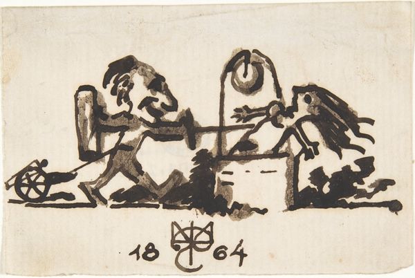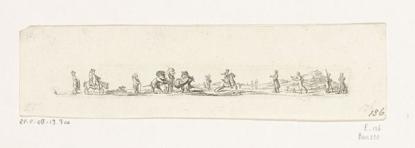 Editor: We're looking at "Zittende man tussen boompjes in silhouet" by Isaac Walraven, created sometime between 1696 and 1765. It's a quirky little sketch. The silhouettes remind me of cut paper. What jumps out at you? Curator: The stark use of silhouette immediately directs my focus to the artist’s process. Look closely – what tools do you think Walraven employed to achieve these dark shapes and delicate lines? This wasn't some spontaneous act of creation, but one heavily reliant on readily available and affordable material processes for widespread consumption. Editor: Well, the description does mention "light pencil work," and other tags suggest ink or pen sketches. But why do you emphasize the affordable and available nature of art-making? Curator: Because understanding the means of production unlocks a deeper understanding of the artwork’s social context. Think about the accessibility of pen and ink versus, say, oil paints in the 18th century. This accessibility democratized image-making to an extent. Also, look at how Walraven economizes his line; nothing is superfluous, every stroke serves a function. How does this conscious frugality inform your understanding of this image? Editor: It does feel economical! Like the artist is preserving a feeling with a bare minimum of mark-making. This reminds me, however vaguely, of other labor intensive art. Curator: Precisely! While seemingly simple, this print hints at the repetitive processes of labor within the larger printing industry that provided livelihoods and distributed cultural capital to the masses. Seeing how Walraven transforms a single scene into readily reproducible product makes me think more about artistic production. It is more that simply seeing a "pretty" drawing! Editor: I hadn't considered it that way before. I'm now considering labor conditions when thinking about this "personal sketchbook" image! Curator: Exactly, seeing the process changes the final read. This makes me hopeful about expanding the role of accessibility to inform material explorations.