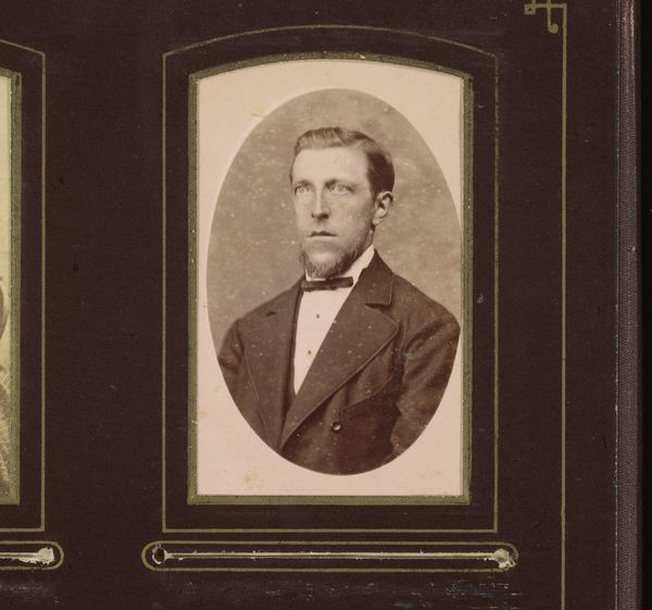 Curator: Oh, he's got that "first dance" look, doesn’t he? A touch awkward, undeniably sweet, and hoping nobody notices his sweaty palms. Editor: Indeed. Here we have a photographic portrait from somewhere between 1868 and 1900 by Adrianus van Beurden titled "Portret van een jonge man met vlinderstrik"—"Portrait of a young man with a bow tie". The formal composition and sepia tones root it firmly in that late 19th-century Romanticism movement. Curator: Right? It feels like stepping into a time machine. He’s frozen there, in that perfect moment of being almost a man, still clinging to boyhood, maybe? You can almost feel the heavy wool of his jacket! Editor: Observe the subtle nuances within that sepia palette. The high contrast renders sharp delineations between planes, highlighting texture and form, but there is also a softness, especially around the oval vignette. The composition emphasizes verticality, the sitter framed centrally, drawing attention to his face. Curator: I keep coming back to that expression. He's holding back a smile, I think. Maybe a touch nervous under all those layers of respectability. Is it just me, or is there also something terribly modern in his gaze? It’s like he is right here, right now. Editor: What you perceive as “modern,” I interpret as an artifact of Romanticism—that exploration of human emotion and the inner self through visual expression. Note how the photographer manipulates light to subtly sculpt his face, guiding your eyes to those emotive focal points, capturing perhaps a fleeting glimpse into the subject's psychological space. Curator: See, that's what I love about these old portraits! They were meant to show how things were, but instead, they hint at how things felt. Like all these formal poses couldn’t completely tame that glimmer of mischief or sorrow lurking under the surface. Makes you wonder what stories this bow-tied boy could tell. Editor: Yes, art transcends its intrinsic materiality by imbuing within the viewer a deep and palpable curiosity of form and matter, and a sentimental connection through time.