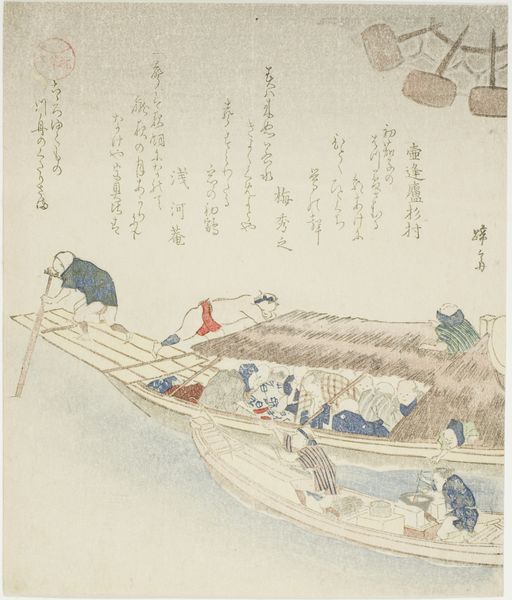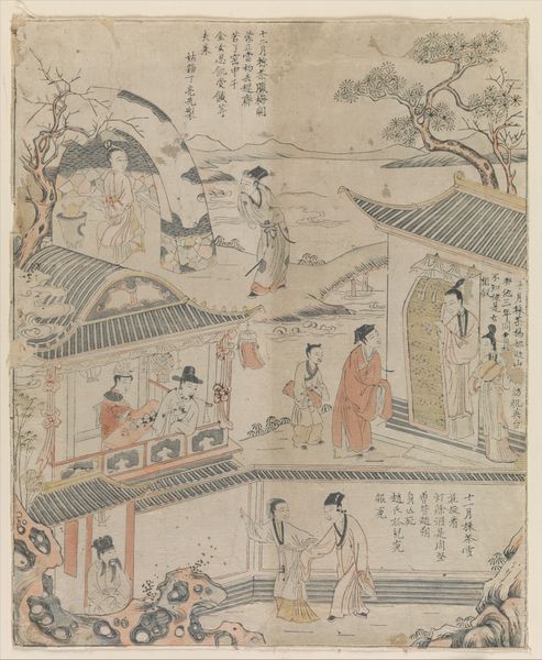 Curator: We are standing before "Tiger Gate," a print made with ink and watercolors by Ryūryūkyo Shinsai around 1818. This piece, which now resides here at the Minneapolis Institute of Art, presents a wonderful example of ukiyo-e. Editor: Wow, that title definitely undersells the vibe. It's ethereal, almost like a dream. There's something incredibly tranquil about the muted colors and the way the figures seem to float across the landscape. It’s gentle. Curator: Yes, Shinsai's work frequently incorporates elements of figuration set within landscapes, a characteristic element of ukiyo-e. There's an emphasis on capturing everyday scenes and moments. I think that’s something special for us, centuries later, to be witnesses of a past mundane. Editor: What fascinates me are the figures. They carry such stillness, yet there's a subtle narrative suggested by their placement and the items carried by the robed figure at the vanguard. It feels less like a depiction of reality and more like an invocation of memory, each color wash deliberately layered to evoke specific emotions. Curator: Consider that these images would have circulated among the elite. The figures, likely geishas and their entourage, offer a glimpse into a very specific echelon of Japanese society. Ukiyo-e served not just as art but also as a record of fashionable culture and status. Their elaborate robes echo traditional narratives through textiles, patterns, and symbolism. Editor: It’s almost as though we're peering through time. Though, with the stylized execution and tranquil aesthetic, you forget that a rigid social structure underscored even seemingly innocuous journeys. And somehow this tension makes it all the more impactful. Curator: Indeed. The artwork encapsulates cultural memory while subtly underscoring societal complexities through carefully chosen imagery. It presents a unique intersection between historical record, social critique, and sheer aesthetic delight. Editor: Ultimately, “Tiger Gate” pulls you in; there's a quiet invitation here. You begin to see that it reveals much more than first glance allows. What started as a subtle sketch becomes a compelling exploration of time, status, and emotion.