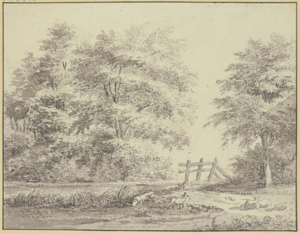 Curator: The overwhelming feeling here is of quiet industry, would you agree? There’s an understated connection to nature, particularly water. Editor: Yes, there is that stillness about it. Before we delve too deep into subjective experience, let's orient our listeners. This is "Landschap met een man die uit een schuur komt," or "Landscape with a Man Coming out of a Shed," a pencil drawing by Johannes Petrus Waterloo, created sometime between 1800 and 1870. Curator: "Landscape" is almost an understatement. It’s the figure emerging from the shed that really holds my attention. The shed itself is rather primitive in construction. Its dark doorway echoes universal concepts of birth, the threshold, initiation… I feel that simple structure taps into much more primal territory. Editor: I see your point about that “dark doorway.” It reminds me a little of similar, slightly later images we find associated with the emerging industrial age, where rural life is often either sentimentalized or, conversely, is cast in terms of the primitive to make way for ideas of ‘progress’. The artist’s emphasis on realism – just look at the detail of the trees, and their mirror images in the river - contrasts with that quite crude building, almost suggesting decay. The question for me is: Is it an idealized depiction of Dutch rural life, or a reflection on the decline of that very way of life? Curator: Perhaps both? I find it significant that the human figure is placed directly in that doorway, bridging the structure, embodying the transition between what’s within and without, a nexus where the viewer might be expected to pause and meditate. There are a couple of boats at the ready, but also a toppled wooden cart – tools ready for work and maybe relics of it, abandoned too. Editor: Those fallen, aged timbers, that abandoned cart, do hint at transition, indeed. The little detail of a distant church spire adds another layer too. It places it, as a historical artifact within a particular moment. One poised between traditional agriculture and larger social changes, as you implied earlier. Curator: Yes, there is so much quiet complexity captured here through such humble materials: pencil on paper. Waterloo asks us to witness more than just a man emerging from a shed; he prompts us to contemplate humanity’s relationship with shelter, work, nature, and spiritual continuity. Editor: Agreed. Waterloo’s work becomes more interesting, the longer you examine it, precisely because it speaks to multiple social registers in quite a muted fashion. Thank you for that compelling interpretation.