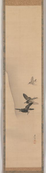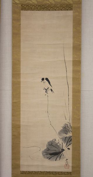 Editor: This is "Squirrels on Bamboo and Rock," an ink drawing on paper by Kano Osanobu, created sometime between 1810 and 1830. It’s a muted landscape with such a whimsical feel. What's your take on this piece? Curator: It's tempting to see this image as simply decorative, a charming snapshot of nature. But situating it within its historical moment, Japan’s Edo period, reveals a potentially more complex story. We have rapidly urbanizing populations, increased merchant power and influence in what had previously been rigidly controlled society. How might depictions of "nature" function in this environment? Is this pure observation or something more intentional? Editor: You mean, could it be a commentary on societal shifts, perhaps referencing power dynamics? Curator: Exactly! The squirrels themselves are a key point. Are they simply charming creatures, or do they stand in for something else? Their placement within a bamboo grove might allude to specific social classes or even political factions. The way nature is controlled or framed here, is itself worthy of inquiry, it subtly mirrors the existing power structures in society. The natural world, much like the societal one, has its own kind of hierarchy, a subtle push against rigid order that we see in paintings like this. What do you think of the use of empty space within the work? Editor: I hadn't thought about the symbolism of the animals themselves! I focused on the serene feeling of the image overall, the light washes, but I understand how one can also see a more subversive commentary. The emptiness could be about open futures or possibilities... Curator: Precisely, reading the blankness could be the possibility of futures, which is so interesting for that time period. Editor: Wow, I'm seeing it completely differently now. Thanks so much!