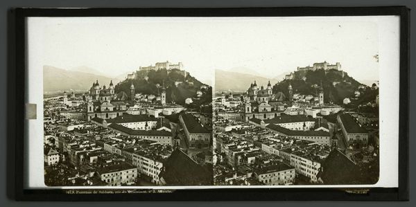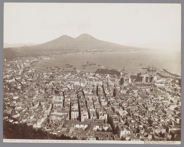Editor: This photograph, “Gezicht op Napels en de Vesuvius, Italië,” was taken sometime between 1860 and 1870 by Ferrier Père-Fils et Soulier. The monochromatic image gives the landscape a sense of timelessness. What significance do you see in photographing the volcano, Vesuvius, looming over Naples like that? Curator: Vesuvius, even in repose here, is more than just a mountain; it's a potent symbol, a sleeping giant loaded with cultural memory. For centuries, its presence has shaped the Neapolitan identity, a constant reminder of nature’s power to both create and destroy. Editor: So it’s less about capturing the scenery, and more about capturing an idea? Curator: Exactly. The photographer chose this vantage point intentionally. He frames the city beneath the watchful gaze of Vesuvius. Think about the eruption of Pompeii - a shared understanding even now. The wispy smoke is more than just volcanic activity. It’s the collective memory of Naples itself, a persistent presence passed through generations. Editor: It gives the photograph a weightier feeling, knowing the background and implications. Almost ominous, yet peaceful. Curator: Ominous and peaceful, life and death; those are often two sides of the same coin when we speak of symbolism. Editor: Thank you; that definitely provides a deeper understanding. It’s amazing how much cultural weight can be tied to a single image. Curator: It is, isn’t it? Visual language can carry immense weight, precisely because its symbols work on both a conscious and unconscious level.
