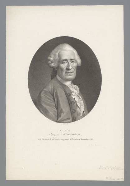 Editor: So, this is Jean Pierre Sudre's portrait of Claude-Louis, Count of Berthollet, dating back to between 1822 and 1827. It's an engraving on paper. He looks rather stern, doesn't he? A real pillar of the establishment. What strikes you most about it? Curator: It's the light, isn't it? See how it catches the powdered wig, almost like a halo. But instead of piety, it speaks to scientific enlightenment, almost… well, not quite godlike, but certainly elevating him above the everyday. And it contrasts nicely with that quite…severe gaze. What do you make of that tiny little pin on his jacket? Editor: I noticed that! It's a detail that hints at his achievements, maybe? Is it common to highlight scientific figures like this during this era? Curator: Absolutely! This is peak Neoclassicism; think order, reason, the glory of the mind! Remember, the late 18th and early 19th centuries were mad for science, right? It’s not just capturing a likeness but lionizing him! Making him part of…of a new kind of aristocracy – not birthright, but brains! Does that ring true, d’you think? Editor: I see that, it connects with all those marble busts of thinkers from antiquity. So, even in a print, they are promoting science itself. Fascinating. It almost humanizes the field and makes it worthy of honor and respect, right? Curator: Bang on! He becomes an emblem of progress, just like a Greek philosopher, but brought dazzlingly up to date. Food for thought indeed! It’s also nice how we are able to zoom into this artwork and appreciate it, as if it was really there with us. Editor: I never considered all of that. This piece definitely deserves more than just a passing glance. Thanks!