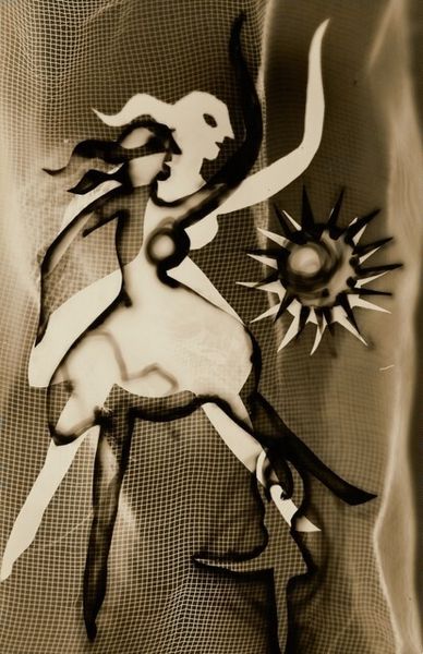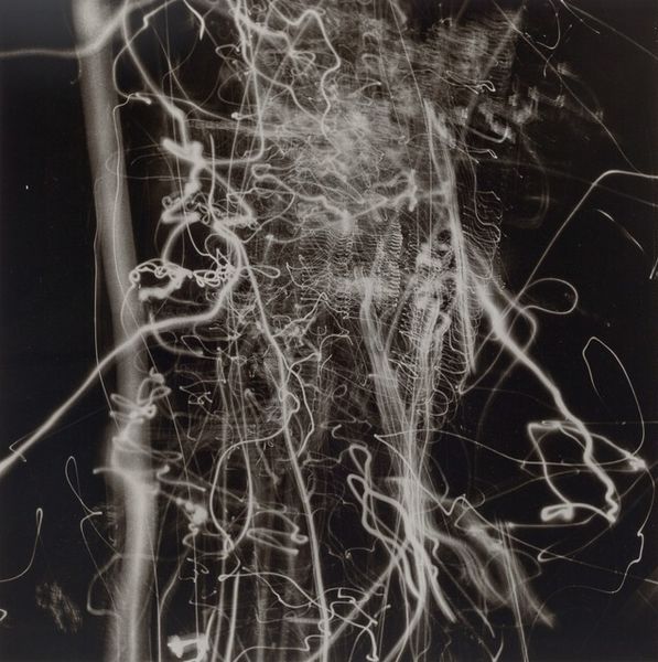 Curator: Man Ray's "Le Souffle," or "The Breath," made in 1931, is a striking example of his rayographs. Editor: Ghostly, isn't it? Like peering into a spectral machine. It gives me the chills. The fan appears to struggle against those strange serpentine lines. Is it a prison, or are they blowing it forward? Curator: Rayographs are camera-less photographs; he made them by placing objects directly onto photographic paper and exposing it to light. He experimented with a host of commonplace objects: household items, tools, you name it. It’s important to understand the broader context of the avant-garde, where artists deliberately challenged traditional artmaking. Editor: Deliberately! Precisely. Man Ray gives us these odd encounters between everyday things, heightening their mystery and sometimes, their absurdity. This piece has an underlying kinetic energy that I cannot escape! It reminds me how much photography changed during the modern era! It's no longer simply representational; it becomes interpretive and strange. Curator: He did create something truly unique. Ray was an American who spent much of his career in Paris within surrealist circles; Dada would challenge art's institutions, and Surrealism explored the unconscious mind, with the help of folks like Andre Breton and so on. These artistic movements helped each other, so by then it was all about testing out new boundaries for making something visually interesting that challenges everything. Editor: So you're telling me this picture’s less about documentation and more about... well, dreams, nightmares even? This ghostly fan against a void feels very cinematic! I love how it evokes speed without really being about motion. Curator: Think about what’s missing too. Absent from view is, of course, the photographer, camera or no. His touch remains the prime ingredient. It’s very evocative of the modernist drive to find a novel artistic approach, pushing the limits of traditional techniques and ideas about form, materials and the final piece. Editor: Looking back, there’s so much restless curiosity that permeates his works. This exploration using a fresh method on objects of function, speaks to an artist unafraid to blow convention away. Curator: Indeed, and "Le Souffle" stays there—an air current pushing out new ideas of how artwork could be defined and what we might discover within it, given the proper light.