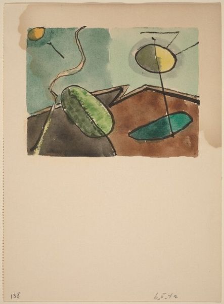 Editor: This is Arthur Dove’s "Untitled" from 1942, done with watercolors. It’s a fascinating arrangement of geometric forms and organic shapes. It's so muted, yet something about the composition feels almost like a landscape… What do you see in this piece? Curator: Well, first it’s essential to situate Dove within the American Modernist project, a conscious effort to create a distinctly *American* art, independent of European traditions. It's worthwhile considering the cultural milieu during 1942, the height of World War II. Do you think that might have impacted its reception? Editor: Perhaps, the abstraction feels almost escapist. Like a move away from representing reality… Curator: Exactly! And that gets to a central tension. Many embraced abstraction as a universal language of feeling during turbulent times, offering solace amidst social upheaval, while others saw it as detached from social realities. It can reflect isolation but can you also see this an exploration of pure form? Editor: Yes, it feels almost like he’s breaking down a scene into its bare essentials. It seems the painting seeks pure expression of form in a moment where socio-political tension might otherwise affect production of more figurative artwork. But could we call this a political act? Curator: Precisely. The question is, what kind of politics? Is it a quiet resistance against prescribed artistic conventions, or a detachment from immediate political struggles? Think of museums promoting abstract art in this time frame too - where might this fit? Editor: That is interesting, it could be seen as both a refuge and a bold statement in that time. Curator: Right. And this piece pushes us to consider the complicated relationship between art, history, and social change. Editor: Absolutely. I see how placing it within its historical moment makes its artistic choices all the more compelling. Thanks!