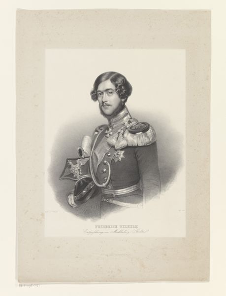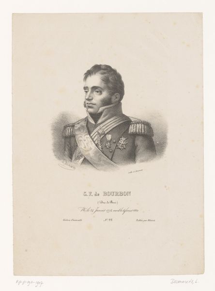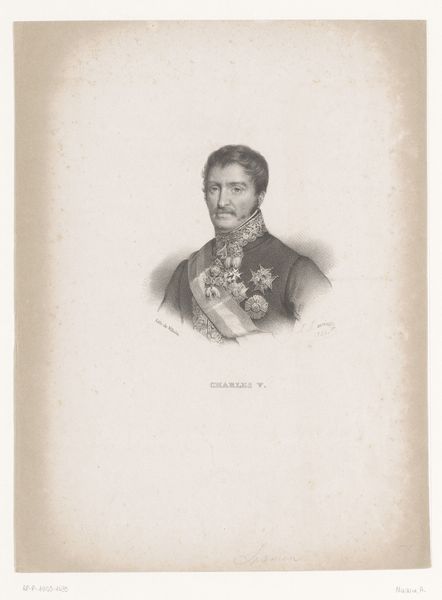 Nicolas Maurin created this print of Carlos María Isidro Benito de Borbón around the 1830s, likely in France. It depicts the Spanish Infante Carlos, a figure who embodied conservative resistance during a period of intense political upheaval in Spain. The image is striking for its detailed depiction of Carlos adorned with royalist symbols. This was a time of civil war in Spain, and portraits like this were tools of political propaganda. They served to legitimize Carlos' claim to the throne, visually encoding a set of social values tied to monarchy and tradition. Understanding this work demands that we delve into the institutional histories of 19th-century European monarchies. Scrutinizing period documents such as political pamphlets, newspapers, and even personal correspondence can offer a richer understanding of the print’s role. The image’s historical context reveals it as a potent symbol within Spain's turbulent socio-political landscape.