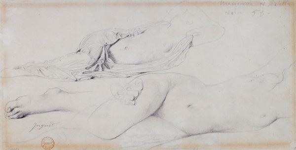 Editor: This is Charles Despiau's "Liggende kvindelig model med hænderne under nakken," created between 1920 and 1923. It’s a pencil drawing of a reclining nude. What strikes me is the almost classical simplicity of the line work. What do you see in the composition of this drawing? Curator: Precisely. We observe here the masterful use of line to delineate form. Note how the contours, while delicate, confidently articulate the volume and weight of the figure. The artist minimizes shading, forcing us to focus on the elegance and precision of the line itself. Where does your eye go first and what impact does it have? Editor: I think my eyes are drawn to the head and arms. They are more defined compared to the torso. Is that intentional, perhaps to create a focal point? Curator: Indeed, the darker, more emphatic lines around the head and arms establish a clear hierarchy, guiding the viewer's gaze. The artist uses a contrast between tightly rendered areas and more open, gestural strokes to give the work depth and dimension. Observe also the placement of the figure on the page: it’s horizontally centered to make use of its edges as opposed to escaping them. Editor: So, it’s the formal relationships within the artwork itself that create its meaning? Curator: In essence. By analyzing the formal elements—line, composition, and the interplay of light and shadow—we come closer to understanding Despiau's artistic intentions and achievements in conveying both structure and softness. Editor: I see! I was so focused on the subject that I didn't appreciate the artist's mastery of form itself. Curator: It's a subtle yet profound exercise in appreciating art. Paying attention to the relationships and formal arrangements that lead us to meaning. Editor: It has really altered how I will look at works on display today!