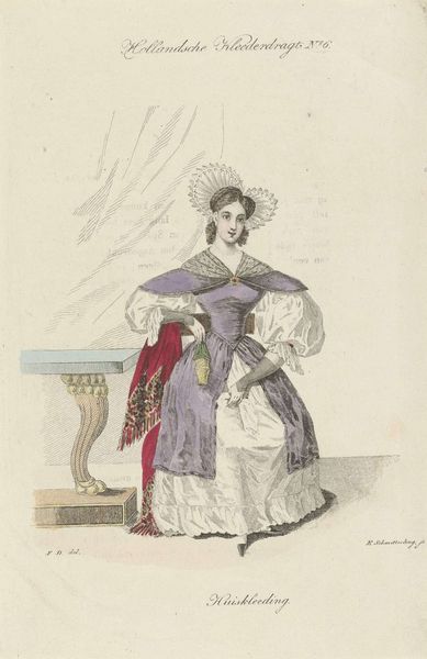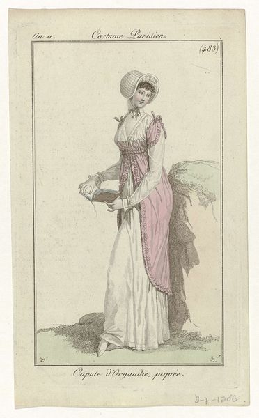Editor: This is "La Belle Assemblée, 1 June 1822, No. 162: Walking Dress," a watercolor print from 1822, created by an anonymous artist. I'm struck by how precisely rendered the details of the dress are; you can almost feel the texture of the fabric. What stands out to you when you look at this image? Curator: This image, beyond simply illustrating fashion, is brimming with social cues. Consider the umbrella, for instance. Beyond its practical use, what symbolic meaning might it hold for this woman and her station? Editor: I suppose it suggests refinement and leisure; someone who doesn't need to work outdoors. Curator: Exactly. Think about the cultural narrative woven into clothing and accessories. The delicate colour palette, the feathered bonnet, all of these symbols communicate something deliberate to an audience familiar with the period’s visual vocabulary. How do you think contemporaries viewed this figure, understanding these cues? Editor: Perhaps as a representation of ideal femininity or aspiration, a visual shorthand for status and taste? Almost like a codified language. Curator: Precisely. This “walking dress,” becomes less about mere utility, and more a symbolic expression – how we fashion ourselves to be seen, and perhaps, even remembered. Are there echoes of this in how we communicate status through fashion today, do you think? Editor: Absolutely! It's amazing how clothes become cultural touchstones and emotional carriers across time. Curator: Indeed. Images like this are cultural memory made visible. We start to realize fashion is more than just fabric, it's a language.