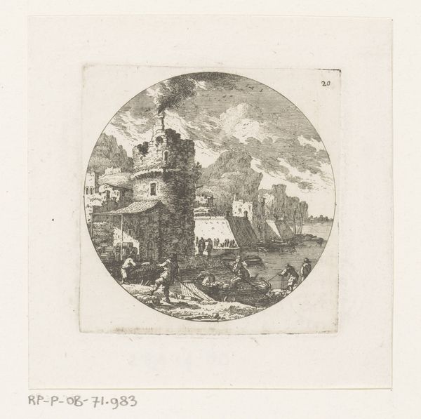 Editor: This is "Bedrijvigheid op kade aan zee," or "Activity on a Quayside by the Sea," an etching by Nicolas Perelle from the Dutch Golden Age. It’s a bustling scene, but almost dreamlike with the etching style. How do you interpret this work, especially given its depiction of labor? Curator: I see a snapshot of 17th-century Dutch maritime power and the labor underpinning it. It’s easy to romanticize the Golden Age, but prints like this offer a glimpse into the social hierarchy and economic forces at play. Consider the figures working—they are nameless, faceless even. Where are the markers of individuality? Editor: I see what you mean. They're almost like cogs in a machine, contributing to this larger scene of maritime commerce. Curator: Precisely! And within that context, we should also ask: who is this art *for*? Who would be able to afford or access prints like this? Was it meant to enshrine this hierarchy? The romantic, idealized scene of boats on the water hides what? Editor: So, it’s both documenting a scene and subtly reinforcing a particular worldview tied to the period’s power structures? Curator: Yes. Etchings like this were part of a visual culture that normalized these socio-economic divisions. Understanding that is vital when looking at these genre scenes. It opens up space to ask about other, absent narratives. What perspectives are left out of this "golden" picture? Editor: I hadn’t considered the implicit message within such a seemingly ordinary scene. It makes you question the purpose behind what is presented. Curator: Exactly! Art isn't created in a vacuum. It’s a mirror reflecting society, but sometimes that mirror is deliberately distorted. I will look at these kind of prints with other eyes, it has been enlightening. Editor: Me too!