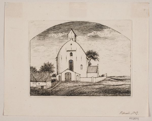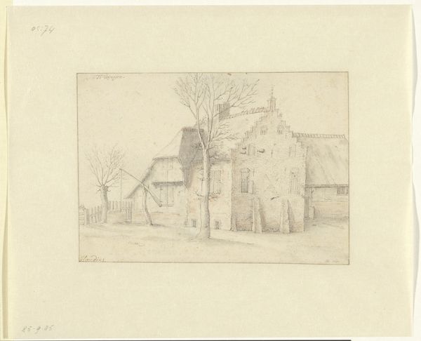 Curator: This sketch is entitled “Gezicht op huis de Borgel bij Deventer,” which translates to “View of the House Borgel near Deventer.” It’s a pencil drawing by Jan Striening, created in 1861. What strikes you about it? Editor: It feels like a half-remembered dream. Ghostly. You can almost smell the damp stone and hear the distant clip-clop of horse hooves on a cobblestone street. The aged paper definitely adds to that. Curator: The drawing captures a specific location and time. What’s fascinating is the interplay between the artist’s attention to detail and his somewhat Romantic sensibility, that gives it an ethereal quality. Editor: Right, you get a good sense of place, even though it is lightly sketched. I notice how the main building dominates the foreground. It’s so much detail compared to the sketchiness in the background around the outbuildings and the dog lounging by the cart! Curator: Observe the stepped gable of the main building—that ornamental flourish speaks to a desire to imbue even a functional farmhouse with a sense of grandeur and civic pride. We see these architectural details often used to signify status. Editor: Interesting. I’m also wondering if that is smoke rising from a chimney, it makes you imagine what life was like then, or rather, what the artist imagined it to be. Curator: Yes! Striening is carefully constructing a visual narrative that’s deeply rooted in a specific place. That little detail brings it alive. Even this landscape adopts symbolism that becomes timeless, as humans and temporality are involved in creating it. Editor: Well, I’m completely enchanted. I’m off to find my own Borgel. Thanks for helping me look closer! Curator: It was a pleasure. May your own artistic explorations be as fruitful!