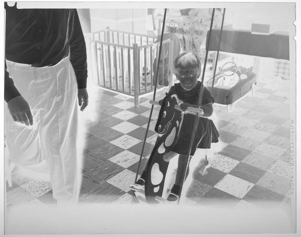 Editor: This photograph, "Untitled (woman with children, little boy with toy gun)" by Lucian and Mary Brown, is a small black and white print of a child pointing a toy gun. It's... unsettling. What do you see in this piece that I might be missing? Curator: It's interesting you find it unsettling. The reversed tones give it a dreamlike quality, don't they? It makes me think about how we project our fears and anxieties onto childhood innocence. The toy gun becomes less about play and more about... what? A symbol of a future we fear? Editor: I hadn't thought about it that way, about projecting anxieties. I was just reacting to the gun. Curator: It's a powerful image! It invites us to consider our own reactions and the stories we tell ourselves about childhood and violence. The artists prompt us to think deeper. Editor: It definitely makes me think. Thanks for opening my eyes to its complexity.