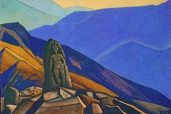 Nicholas Roerich painted this piece, Maitreya, with what looks like tempera or maybe gouache. Roerich is going for something beyond just representation. The mountains in the background are simplified, right? Like geometric forms stacked on top of each other, and he’s playing with this limited palette of blues, greens, and earthy tones. It's less about capturing a realistic landscape and more about evoking a mood, a sense of spiritual depth. Look at the figure in the foreground. It’s a rough sculpture, monumental and iconic, painted in flat golden tones. Roerich uses color and form to distill the essence of the scene, making it feel both ancient and timeless. It’s as if he’s trying to capture the feeling of being in a sacred place, rather than just painting a picture of one. It reminds me of Hilma af Klint, someone else who found a pictorial language to express spirituality. What they both did was leave lots of room for the ineffable, a recognition that a painting is always an unfinished thought.