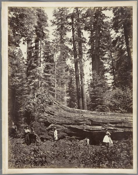 Curator: Carleton Watkins’s “Hutchings Hotel, Yosemite,” taken sometime between 1870 and 1874, presents a captivating view of early tourism in Yosemite Valley. Editor: My first impression is the stark contrast. The dark, dense forest gives way to a shimmering river, almost as if a curtain has been drawn back, revealing this little slice of…well, not wilderness, exactly, with the hotel in the distance. Curator: Exactly. Watkins wasn't just capturing untouched nature; he was framing it within the context of human development. The Hutchings Hotel itself becomes a symbol, representing the increasing accessibility and commodification of the American West. Consider also the Hudson River School influences – the way he composes the scene to elicit a specific response. Editor: The material reality is intriguing. Look at that fallen tree in the foreground—a natural barrier. It's almost as if nature itself is resisting this intrusion. And the smooth, flowing water achieved with a long exposure. Watkins had to wrestle with his equipment in a challenging environment. Think of the labour involved, processing these large format negatives, probably right there on site in a portable darkroom. Curator: That tension is precisely what makes the image so compelling. We’re confronted with the romantic ideal of unspoiled wilderness alongside the tangible presence of industrial progress, influencing even leisure itself. It makes one consider ideas of manifest destiny in terms of landscape itself being conquered for an industrializing nation’s pleasure. Editor: It’s interesting how he balances what is considered fine art photography with documentation. This image isn’t simply “art.” It served a promotional function, shaping the narrative of Yosemite for prospective visitors and investors. Those hotel builders must have made a handsome investment based in part, probably, on the evidence of works such as this. Curator: It also raises interesting questions about ownership and representation. Watkins was documenting a landscape already deeply entwined with indigenous histories, histories largely erased from these romantic portrayals intended for affluent white Americans and Europeans. Editor: Precisely! Ultimately, I’m drawn to this photograph’s testament to the laborious process of making and selling an image, quite literally. It's more than scenery, it’s commerce. Curator: Yes, I appreciate how it challenges our notion of photographic truth and the forces that drive our experience of even wild landscapes. Editor: It certainly gives me a fresh appreciation of just what it took to frame a photo, both materially and socially, at that time in history.