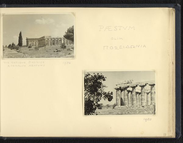 Editor: This is "Twee foto's van de tempel van Athena in Paestum," two photographs of the Temple of Athena in Paestum, taken around 1950 by Norbert van den Berg. They are simple black and white prints, capturing these ruins. I'm struck by how the photographs, despite being relatively recent, frame the temples as ancient and monumental. What strikes you about this pairing of photographs? Curator: The interesting thing for me is thinking about the photographer’s choice to capture these particular views, and for what audience. In 1950, travel to Italy, and documenting the grand tour locations were increasingly accessible, shifting away from the realm of wealthy elites. How does van den Berg’s photography reflect that democratization of travel and image-making? Editor: That’s a good point. So it's less about discovery, and more about almost like, a photographic souvenir for a burgeoning middle class engaging with classical culture. Do you see that impacting the style in any way? Curator: Absolutely. Notice how the classical architectural forms are presented almost didactically, these temples, once sites of ritual and civic life, become spectacles of history for a tourist audience, their meaning mediated through the lens of post-war Europe, their ruins speaking to ideas about cultural resilience or the ravages of time, all framed for the visitor's gaze. Editor: It is interesting how something as seemingly simple as vacation photos can tell a much richer story about society, access to culture, and the evolving perception of history itself. Thanks. Curator: Indeed. Photography, like all art, carries within it the social context of its making.