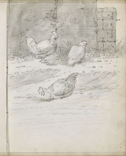 Editor: This sketch, "Blank page; verso: Small Landscape; Chickens," by Sanford Robinson Gifford, is a delicate study. The chickens evoke a sense of domesticity. What cultural echoes do you hear in this seemingly simple sketch? Curator: The chicken, often a symbol of rural life, can also represent vulnerability and abundance. Gifford's loose rendering contrasts with the bird’s symbolic weight in various cultures. What does the combination of landscape and fowl suggest to you? Editor: Perhaps a grounding in the everyday, even within an expansive vista? Curator: Precisely. Think about the chicken as a common, almost universal animal. Juxtapose that with the Hudson River School's emphasis on the sublime. Does this pairing create tension, or harmony? Editor: Harmony, I think, a connection between the grand and the humble. I hadn't considered the chicken's symbolic resonance before.