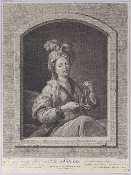 Editor: Here we have "Vrouw aan haar toilet," or "Woman at her Toilet," an engraving made around 1705 by Bernard Picart. The woman's glance is disarming and a little haughty, a mood emphasized by the luxuriousness of her surroundings. What stands out to you in this piece? Curator: I see a fascinating commentary on the societal constraints and expectations placed upon women during the Baroque period. Picart has captured a woman caught between private rituals and public presentation. Consider how her gaze challenges the viewer, almost demanding acknowledgment of her agency within a culture that simultaneously idealized and objectified women. Editor: So you see the woman's look as powerful, rather than... vain, for instance? Curator: Exactly. Look at the composition itself – the oval frame, the objects meticulously arranged on the table – they are visual metaphors for the curated life women were expected to lead. Each item speaks volumes about class, beauty standards, and the performance of femininity. Also note the artist was French, and this was during the reign of Louis XIV and his emphasis on elaborate ritual. Editor: So her "toilette," it's not just about getting ready. It's also a cultural statement? Curator: Precisely. It's a site of both confinement and potential empowerment, reflecting a broader struggle for identity and self-expression. Her engagement with this "toilette" could also speak to what was considered "proper behavior." Editor: I see that, now. So many layers hidden in a simple scene. Curator: These details are key for thinking about this era and understanding women's position, not merely in the art world, but more so what art revealed about their complex role in the Western imagination. Hopefully more people will investigate this artwork.