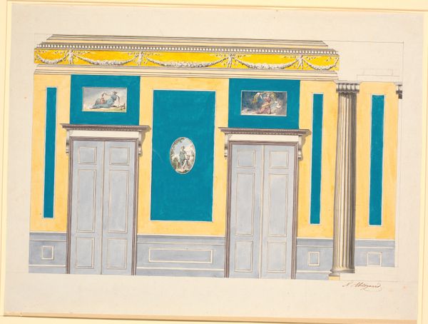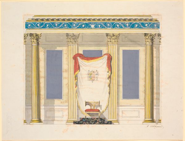 Editor: So, this is "Vinduesvæggen. Udkast til dekoration til Riddersalen," a watercolor and pencil drawing from the 1790s by Nicolai Abildgaard. It’s a design for a room, I guess? I’m immediately struck by how… theatrical it feels. All those columns and drapes, almost like a stage set. What do you see in this piece? Curator: Theatre is an excellent observation. Abildgaard's Neoclassical style pulls heavily from antiquity, and for that era, classical architecture wasn’t just about aesthetics. Think about the Roman Senate, or Greek amphitheatres—architecture embodied power and civic virtue. These weren't just backdrops; the symbols invoked a very specific emotional and intellectual response. Do you see any repeating motifs? Editor: Yes, the columns, obviously, and the swags at the top. And these circular medallions with figures inside. Curator: Exactly. The columns, the medallions, the friezes...they speak of order, reason, and a connection to a glorious past. It's more than decoration; it's about creating a space imbued with a particular cultural memory, a feeling. The curtain further hints that this is not just an empty performance but also something very real, just behind those blue curtains. Editor: So it's like a stage, but a stage meant to inspire certain feelings and ideas in the people experiencing the space? It almost feels a bit manipulative, knowing that. Curator: Manipulation may be a strong word. How about intentional cultural placemaking? The goal isn't simply to impress but to connect the present with a lineage, lending legitimacy and gravity to those within the space. Do those associations and ideas change over time, though? Editor: That's fascinating! I hadn’t considered the active role architecture plays in shaping our understanding of the world and in the past. It feels like this room is a monument as much as it is just a room. Curator: Indeed! And understanding the visual vocabulary of a time reveals so much about its aspirations. I think my eyes were truly opened to a unique form of historical perspective.