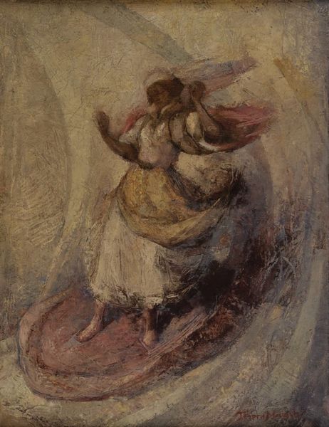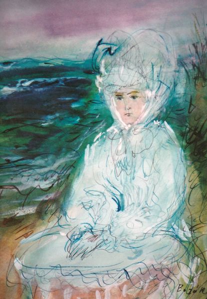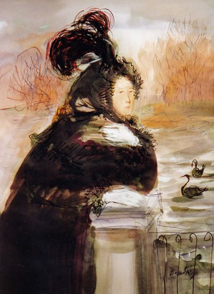 Curator: The work before us is titled "RILKE: The Sonnets to Orpheus" by Maria Bozoky. It appears to be a mixed media work, possibly watercolor, pastel and ink, though the materials are not fully specified. Editor: My first impression is melancholic and a little haunting. There's a fragility in the linework that feels almost dreamlike, especially the figure in the dress. It evokes a sense of nostalgia and lost moments. Curator: Yes, the dreamlike quality is potent. Looking at the motifs, we see the archetypal 'anima' figure turned away from us; the almost classical shape of a girl, standing near organic imagery -- like a tree. The figure appears ephemeral. Given the title references Rilke’s poetry, it might reflect the poet's explorations of death, transformation, and the power of art. Editor: Absolutely. Considering that Orpheus’s myth explores creation and loss, one could argue this piece confronts female artistic suppression through erasure; the shadowy form and the backward glance, the girl becomes secondary to Rilke. Or maybe it is just a portrait of someone walking towards their animal familiar in a garden... Curator: Perhaps; yet in both contexts there's also the motif of the "shadow side," or the inner unconscious coming to be more fully realized. In psychoanalytic theory, both could express different sides of integration and psychological balance. But look too at the black cat... often an animal symbol of crossing over or intuition. This might represent guidance of our anima into form and light. Editor: True, that's certainly another potential reading through a Jungian lens. We might be seeing something about hidden desires, and perhaps reclaiming feminine agency using powerful ancient symbols. Still, my activist's brain sees the title's connection as potentially eclipsing and obscuring any agency this female image may have. It speaks to broader struggles around artistic acknowledgement of female works through the ages. Curator: An insightful take. Perhaps this interplay between light and shadow is precisely the point, creating visual depth in symbolism. The figure isn't fully present, and the symbols create more of a felt emotional state than a concrete portrait, and it asks the viewer to decide if something is coming into, or exiting the garden of our own psyche. Editor: Right, and the painting almost becomes a canvas onto which viewers can project their interpretations of societal tensions. Very interesting, the layers it contains and evokes. Curator: A work with lingering impressions for consideration.