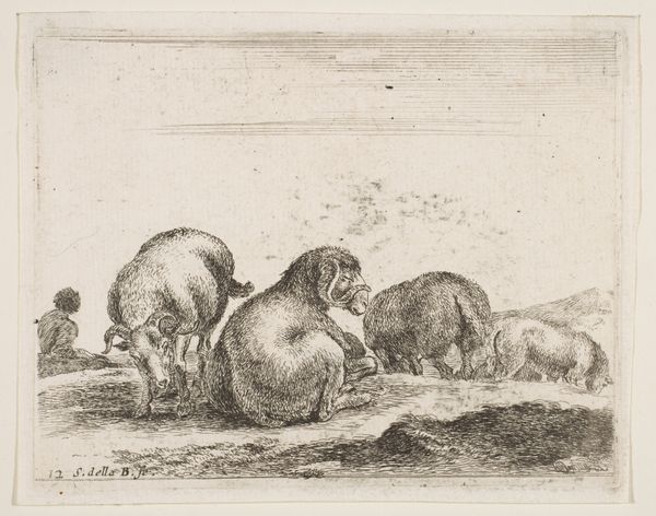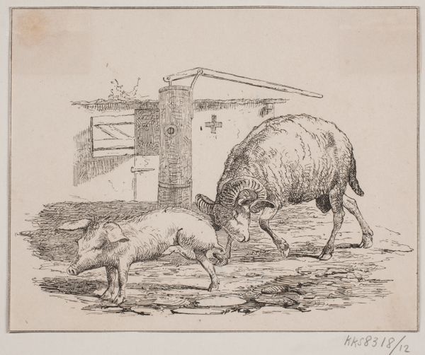 Curator: Let’s have a closer look at Adolph Kittendorff's "Spædkalven" created in 1845, rendered through lithography and drawing. It’s held here at the SMK. Editor: It feels so domestic, almost bucolic. The immediate impression is of everyday farm life rendered in a delicate hand; there’s a distinct visual lightness despite the earthy subject matter. Curator: The seemingly simple subject matter evokes so much about 19th-century agrarian life. Kittendorff emphasizes realism in his detailed portrayal of the animals. There’s an unidealized authenticity that resists Romanticism. Editor: Absolutely, and that is why it feels very democratic and empowering, by centering the animals in such a prominent way in the composition. They appear almost sentient within the larger sociopolitical contexts of animal welfare, ownership and rural poverty, which are worth noting in an intersectional way, I think. Curator: Interesting to view this as more than simply "genre-painting." Consider how the domestic animals have held significant symbolism in art throughout centuries: pigs embodying prosperity, poultry, like the rooster depicted, suggesting vigilance and male virility. Editor: And the ducks? Do they represent adaptation and freedom? The very gathering around water could be interpreted as a moment of peace but also speaks to the necessity of communal resources. There's something distinctly modern about it; a recognition of ordinary rural realities without condescension. Curator: In lithography, particularly with the integration of drawing techniques, we see how this print culture fostered greater accessibility to imagery for wider audiences. Editor: Access yes, but to whom was the visual culture truly accessible, both then and today? Whose lives get celebrated in these mediums and what socioeconomic structures do they subtly reinforce? That said, the print makes a simple scene carry lasting meaning. Curator: These elements contribute to how we remember and frame images from this time period. Even unassuming artworks may bear profound and lasting social commentary. Editor: Absolutely, Adolph Kittendorff's depiction of an everyday farm scene indeed offers enduring insights. It's about critically assessing the messages of representation within its context and today.