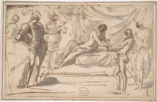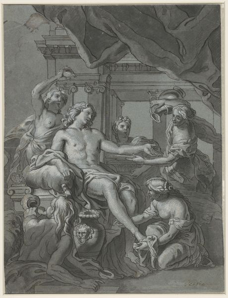 Curator: Giorgio Ghisi, an Italian engraver active in the 16th century, created this print, titled "Birth of Memnon." The piece is currently part of the Harvard Art Museums collection. Editor: It feels like a snapshot of ancient luxury and labor, look at the detail of the bedclothes, the architecture. You can almost feel the textures. Curator: Absolutely. The print depicts the mythological birth of Memnon, son of Tithonus and Eos. What stands out to me is the intersection of divinity and mortality represented here. Eos, a goddess, experiences the very human act of childbirth. Editor: And there’s a real emphasis on the physicality of that experience. The reclining mother, the attendants, the vessel beneath the bed catching blood–all speak to the raw, material reality of birth, contrasting with the idealized figures of the gods and angels. Curator: That's precisely where Ghisi challenges the traditional narrative. By placing the birth within such a visibly material context, it forces us to reconsider the very nature of divinity. How do we reconcile the ethereal with the corporeal? Editor: The labor of creation is front and center, blurring those high/low boundaries. It’s a powerful statement, transforming what could be a simple mythological scene into a complex meditation on the human condition. Curator: Indeed, Ghisi prompts us to consider the universal experiences that bridge the gap between gods and mortals, and how those experiences shape our understanding of identity. Editor: And the means by which that bridge is constructed, the tools, the processes, the bodies involved, cannot be ignored. They ground the story in a reality we can grasp.