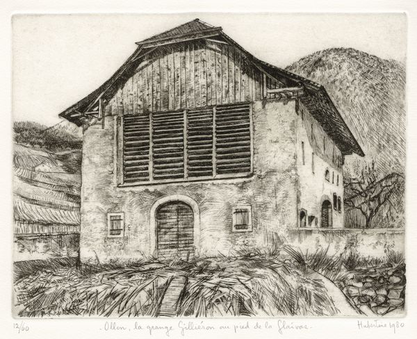 Editor: This is "Norfolk Farm" by Valerie Thornton, we don't have an exact date for it, but it's part of the Tate collection. It’s a print of a farm building, primarily in red and greys. The textures are incredible. What strikes you about this piece? Curator: I see a compelling study in the labor of building and maintaining this structure. The printmaking process itself mirrors that labor, doesn't it? Consider the repetitive, almost obsessive mark-making that defines the surfaces. Editor: Absolutely, there's a rhythm in the marks, like the work of laying bricks. Curator: Precisely! And the choice of materials – the inks, the paper – these aren't accidental. They speak to the accessibility and, perhaps, the everyday-ness of rural life. Editor: That’s insightful. It makes me think about how art materials themselves carry meaning. Curator: Exactly! And how Thornton elevates the mundane, the farm, through her artistic labor. It’s fascinating.